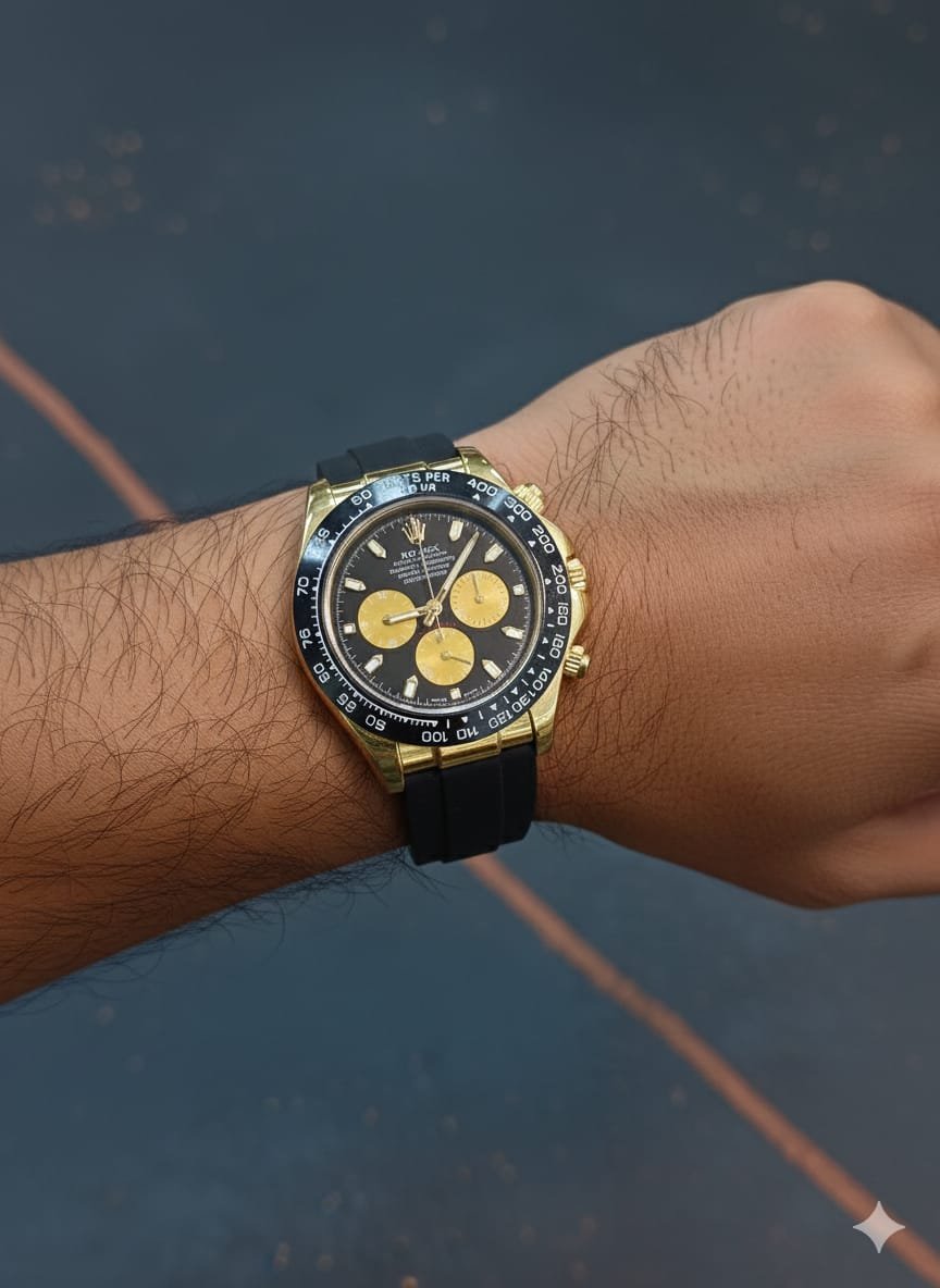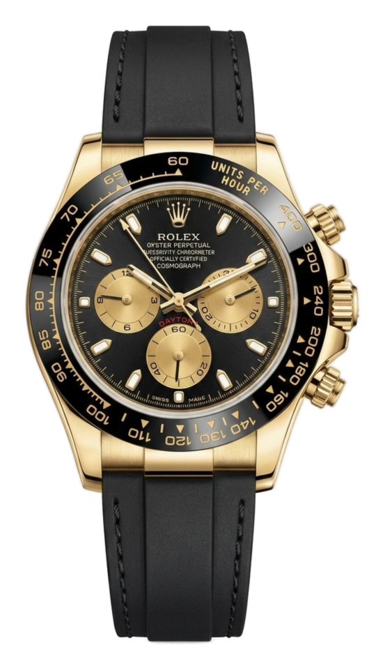 Golden Heritage: Polished gold-tone case with a black tachymeter bezel and gold-accented sub-dials on a black rubber strap.